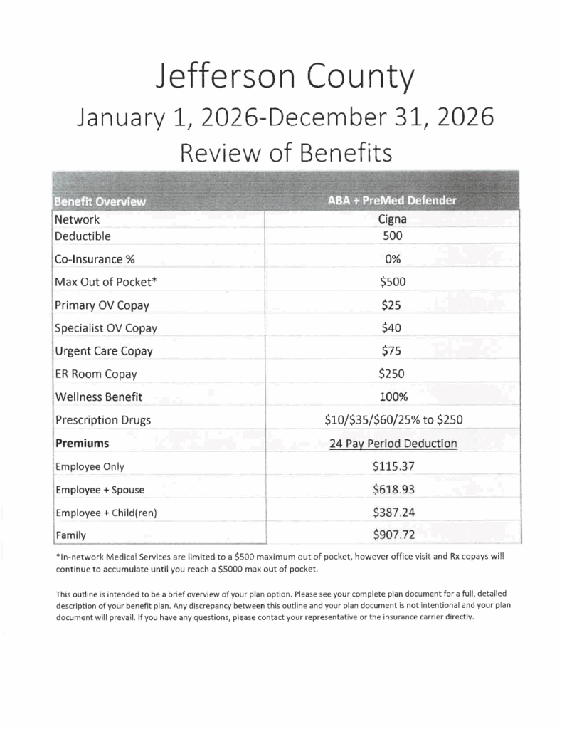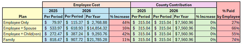 You can see the chart full of numbers below, but I’ll summarize the damage here. In 2026, a Jefferson County employee with individual coverage will go from paying $79.97 per pay period to $115.37. That’s a 44% increase!